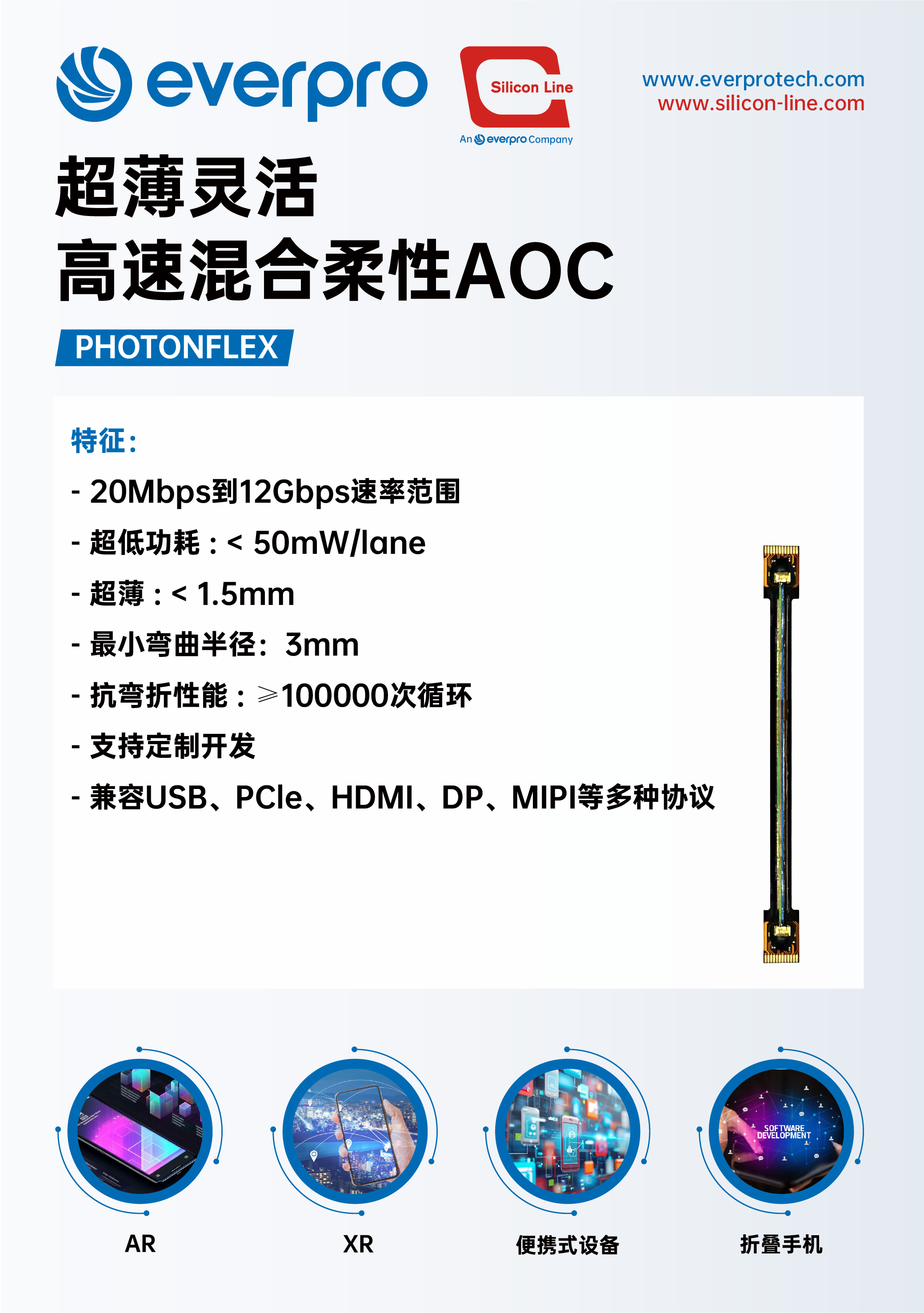 本届CES,俄罗斯专享会全新推出用于AR、XR、折叠手机等领域的高速混合柔性有源光缆方案,更轻薄灵活,支持USB、PCle、HDMI、DP、MIPI等多种协议,满足多样化应用需求。