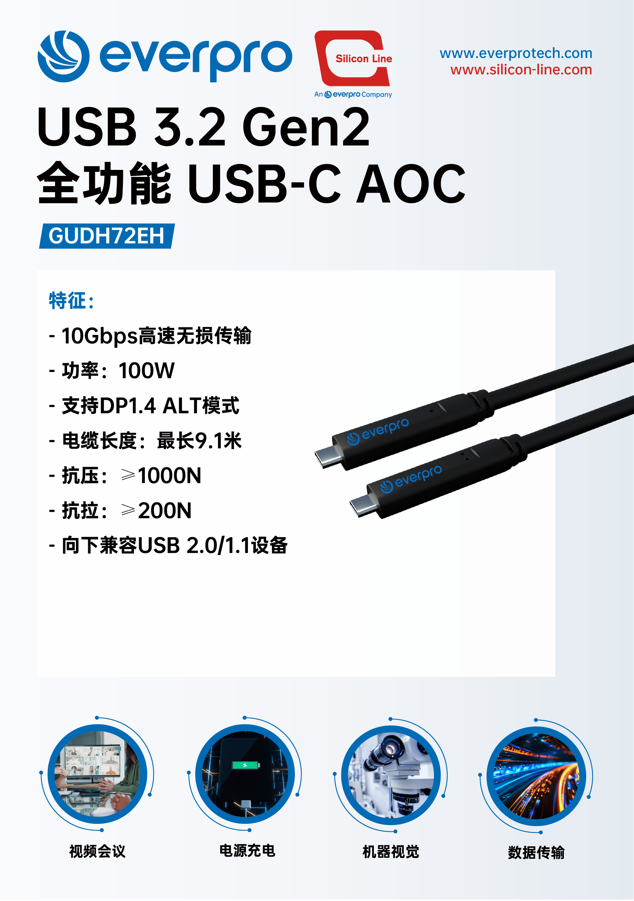 100W USB3.2 Gen2全功能USB-C有源光缆,支持9.1米长距离传输,向下兼容USB 2.0/1.1设备,具备超强抗压抗拉性能,确保稳定可靠的连接体验。