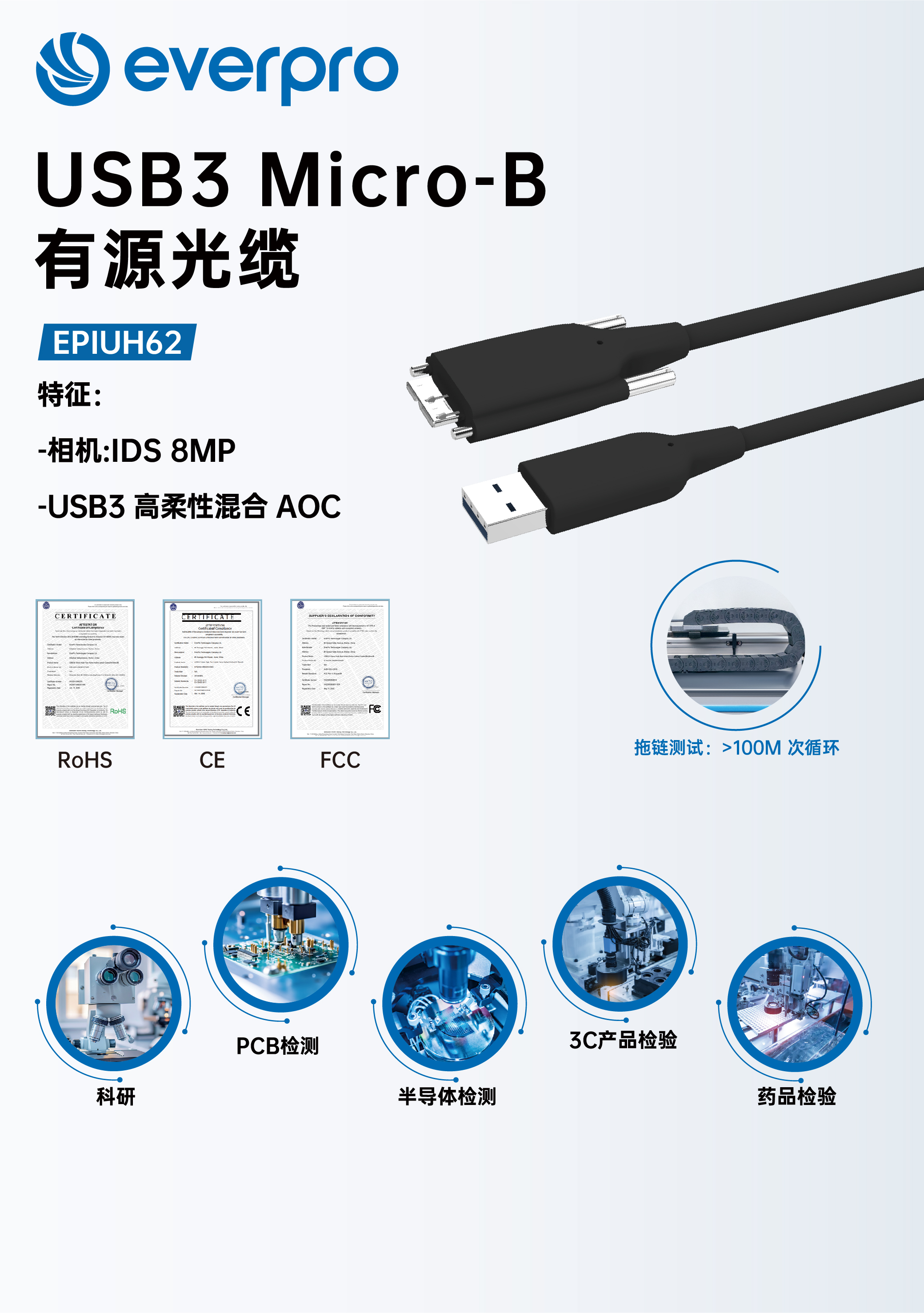 USB-MicroB高柔AOC,专为机器视觉设计,通过了超1亿次的拖链测试,广泛应用于科研、PCB检测、半导体检测等行业领域。