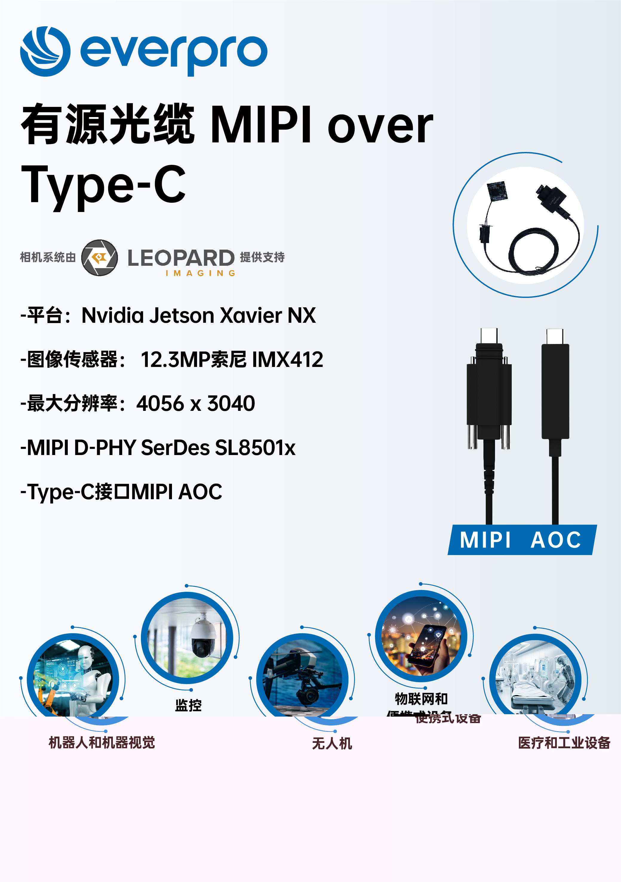 有源光缆 MIPI over Type-C,带宽达12Gbps,实现20米长距离的数据传输,是目前行业内连接距离最长、带宽最大、稳定性最好的MIPI通信解决方案。